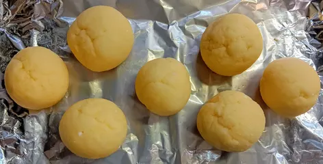 ブラジルのポンデケージョミックスに炭酸水50mlと卵1個とマヨ大さじ1ぐらいを加え、まぜてこねて、ちぎってトレーに並べて、トースターで30分 ❢出来上がりはまんまるだったのに、粗熱取ったらしぼんでしまってたこ焼きっぽく…けど、チーズ香りよくモッチモチに仕上がっていましたよ~♪