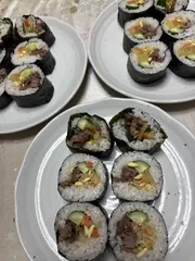 みくさんの豪華な節分料理の近くでお恥ずかしいですが・・💦昨日の夕飯に作りました。娘のリクエストによりキンパです。具材は、牛焼肉・にんじんと豆もやしのナムル・きゅうり・たくあん・玉子焼きです。牛焼肉・ナムル・玉子焼きを作る時にマヨを混ぜました。2日前はナムル丼、そのまた2日前はチュモッパ&プル