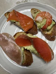 昨日の夕飯に作りました。トーストしたバゲット🥖にサワークリームを塗り、アボカド🥑のディップをのせ、生ハム・スモークサーモン・海老🍤をトッピングしました。アボカド🥑のディップには、アボカド🥑・絹豆腐・マヨネーズ・オリーブオイル・レモン汁・塩胡椒を混ぜました。