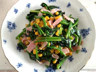 ほうれん草とベーコンコーンをマヨネーズで炒め塩コショウで味付け 風味付けにバターを入れて完成です 風邪やインフルが流行っているのでビタミンたっぷり摂取して乗り切りたいですね