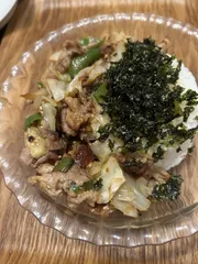 塩胡椒で下味を付けた豚こまをキユーピーハーフで炒めて、キャベツとピーマンと合わせました。醤油と味醂で味を調整して、仕上げにごまと海苔のふりかけをパラパラ!美味しかったぁ。