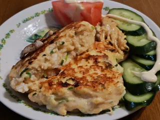 海鮮ハンバーグ エビ、真鱈、はんぺん、卵、フェンネル、白コショウをミキサーで混ぜました(すり鉢が、欲しいところ)。そして追加でネギ、微塵切りのエビをプラス。オリーブオイルとマヨネーズ(←まぜマヨ?)で焼き色をつけました。トッピングは剥ぎ取った真鱈の皮をマヨネーズでカリッと焼いてのせてます。添えたのはたっぷりの「まぜ