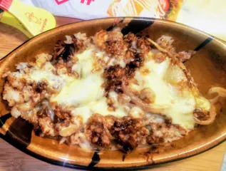 買い出しになかなか行けず、具は玉ねぎ、ひき肉のみです。残りごはんとまぜてチャーハンのつもりでしたが、変更しました💡味噌とマヨネーズで💛まぜマヨ💛したら炒めたごはんとまぜて、チーズを乗せてトースターへ。想像、そして見た目より美味しい味噌マヨドリアができました🙆けっこう簡単でお気にいりに♪(焦げてるけど