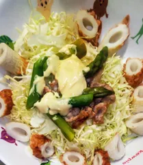 わさマヨサラダ キャベツ、ちくわ、アスパラ、豚肉に、わさマヨ🥗🥢基本的になにが食べたいというよりも、賞味期限が近いものからなにかが出来上がるパターンが多いです💁