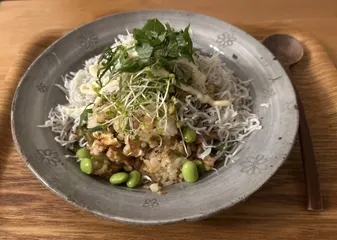 1人の夕飯なので贅沢炒飯 1人の夕飯になったので残り物チャーハンで❣️刻んだ豚肉、紫玉ねぎ、ピーマンをご飯と卵とアイオリマヨネーズで炒め合わせて、しらす干し、ブロッコリースプラウト、枝豆をトッピング。アイオリマヨを仕上げにもかけて、シソをパラパラ。旨味たっぷりで贅沢なチャーハンになりました♪