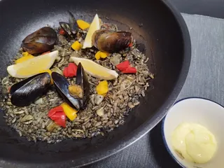 イカスミのパエリア ヤリイカとムール貝、パプリカが入ったイカスミ魚介ソースのパエリアです。マオンソースを添えると少しクリーミーな味わいに。レモンの酸味も爽やかで良い感じです。キューピーさんの懸賞でいただきました。