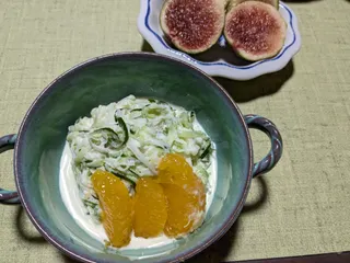 コールスロー コールスロー、マヨネーズと深煎りごまドレッシングを混ぜて作りました。晩ご飯はお肉を少しやいて茄子の蒲焼き、デザートは無花果と梨です。