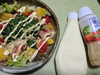 いつものサラダにキユーピーハーフと深煎りごまドレッシングを。ブロッコリーは脇芽を摘んでいます。そろそろ次の野菜の苗と植え替えのために抜かないとなぁと思っています。
