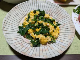 マヨソテー ほうれん草と卵のマヨソテー🥚マヨネーズがプツプツとし始めてから溶き卵を加えて半熟くらいになったら下茹でしたほうれん草も加えてかき混ぜます。溶き卵には白だしと少しの砂糖を加えてあります。仕事で帰りが遅くなったのでお嫁さんがトンカツとコロッケを届けてくれました。野菜サラダにはお気に入りの深煎りごまドレッ