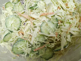 スライス胡瓜、ミックスサラダをキユーピーハーフで和えましたハーフはさらっとしているので食材となじみ和えやすいです〜