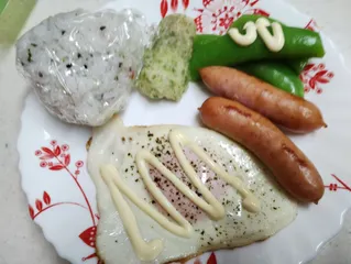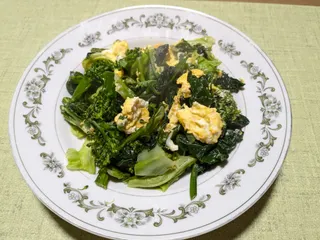 ブロッコリーとほうれん草とキャベツはレンチンして下処理をしてからごま油で炒めフライパンの片方に寄せてキユーピーハーフ入りの卵を加えてふんわり仕上げて全体に混ぜます。味付けは鳥ガラスープとマヨネーズだけです。