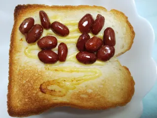 食パンに赤キャップのマヨネーズで線引して金時豆をのせトーストしました半分に折りパクッと頂きました甘じょっぱくて美味しいです🌈
