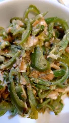 ピーマンのツナマヨ醤油麹 氷水で締めたピーマンをグリーンキューピーのマヨで炒めてツナ缶を投入🙂水分が飛んできたら浜のうまだしで味つけし、最後は子どもと作った醤油麹を和えました。