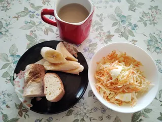 卵も混ぜ込みました 朝ごはん。コールスローと茹で卵。いつもは別々だけど、一つに。マヨネーズで和えてみました。😅卵の黄身がいい感じで混ざって、美味しかったです。バゲットも焼いて、パリパリに。
