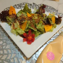 サラダに甘辛スイートチリ味 バターナッツかぼちゃとサニーレタスのサラダに甘辛スイートチリ味をかけました😋
