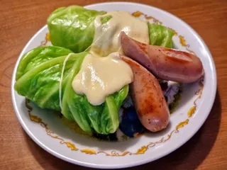 手作りツナマヨをチクワに入れ、さらにキャベツで包んだ、煮込まないロールキャベツ。 油分を切ったツナフレーク、干支の瓶マヨとカルダモン、コショウ、水にさらしたオニオンの微塵切りをまぜまぜして、チクワに入れました。一分ほど湯通ししたキャベツを使ってツナマヨチクワを巻き巻き。かけたのはチーズソー