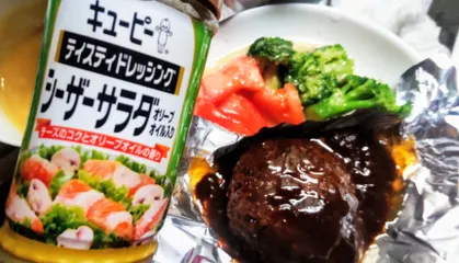 たまには楽をして 疲れたので冷凍ハンバーグ🍚🥢😋付け合わせ🥦🍅には、テイスティドレッシング🥗チーズのコクと香りがつよい😋