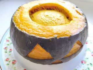カボチャ🎃レンチンして、上部切り取り、綿と種を取り除き、上部の果肉•卵•豆乳•きび砂糖•マヨネーズも加え混ぜ濾して本体に入れて天板にお湯を張りオーブンで焼いて昨日夜から冷やしました。カラメルソース作り、かけて美味しく頂きました。ジャック•オー•ランタン口元が上手く見えずバランスが⋯。🌻