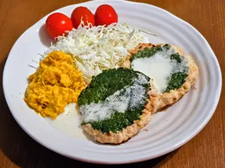 鶏ひき肉の大葉ハンバーグ! 今日は、鶏ひき肉を使ってハンバーグ。ハンバーグには、マヨ/ 卵黄/コリアンダー/塩コショウ、この後すり潰したハンペンを入れました🙃そして大葉。卵白が余ったので、砂糖を少量加えメレンゲ状にしてマヨ/マスタード/カルダモンを混ぜソースに。泡が小さく…。添えたのはカボチャのマヨサラダ。