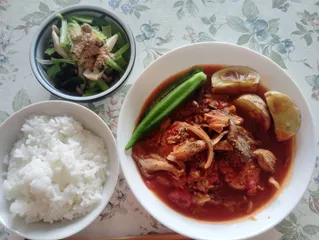 胸肉の煮込みハンバーグ ハンバーグのタネに卵の代わりにマヨネーズ使いました。煮込み料理は、久しぶりです。