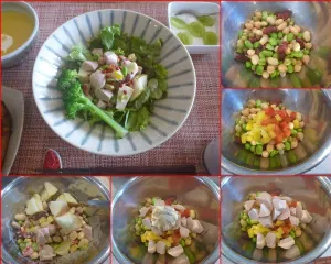 朝食にサラダ豆とりんご、魚肉ソーセージのマヨサラダを作りました。
