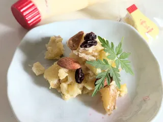 ポテサラにナッツ&ドライフルーツ レンチンして酢 塩 マヨで混ぜたポテサラにナッツ&ドライフルーツをパラパラとかけ人参の葉を添えました ほんのりした甘さがとても美味しかったです