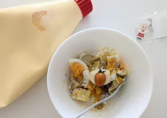 チキンささみ 目玉焼きポテサラ🥔🍳 皮付きのじゃがいもをレンチンしたものにサラダクラブチキンささみ きゅうりを加え目玉焼きを1つフォークで切りながらマヨでまぜました ゆで卵の殻がうまく剥けない!あのストレスを目玉焼きで解消しました✨