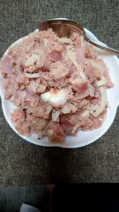 赤いポテサラ ノーザンルビーという赤い皮、赤い実のじゃがいもでポテサラを作りました。茹でて皮を剥くとまるで大きな小豆のようです😳塩コショウ、ダシダで味を整えました。ベーコン山盛りじゃなくてポテサラです😋