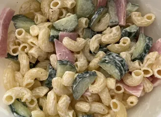 マカロニサラダ 我が家の畑で採れた星形きゅうりと色々な形のマカロニでサラダです味付けはごまドレ+マヨネーズ!個人で取り分けて世界シリーズを追いがけして楽しみます
