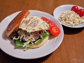 手作りハンバーガー🍔バンズをバターで焼いて挟んだのは、ロメインレタス、玉ねぎのマヨソテー、目玉焼き、シュレッドチーズ、エノキの石づき近くの輪切りマヨソテー。牛の粗びき肉100%のパティに塩コショウ。トッピングはマヨネーズ。横にトマト🍅重ねる順番迷う〜🙄食べるときは、手で押し潰して食べました。黄身と肉