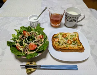 朝食 本日の朝食です🍴😋野菜サラダ・野菜マヨトースト・牛乳・フルーツ酢・ヨーグルト野菜サラダはマヨネーズ&1000アイランドドレッシングを使いました野菜マヨトーストは玉ねぎ・ピーマン・ししとうを使いマヨネーズをつけてグリルで焼きました