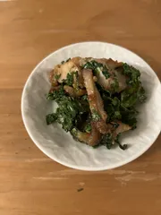 残り物の唐揚げとケールをカットして、少量のオリーブオイルで軽く油を回し、マヨネーズを加えて炒め合わせ塩胡椒で味付けました!仕上げに粉チーズを振れば良かった…😭
