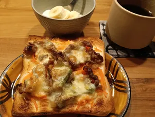 昨夜のビビンバ丼の材料を使って、朝トーストを(^^)マヨネーズを塗ったパンにナムルやお肉をのっけて、最後にチーズ♡