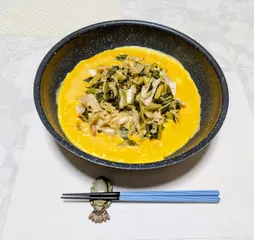 飛騨高山方面の郷土料理「漬物ステーキ」です♪白菜&赤かぶ漬けを炒めて溶き卵を流し入れます卵にマヨネーズを入れました♡マヨネーズを入れる事でふんわりして美味しかったです🍴😋