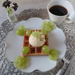 NEW 3時のおやつ💖 おやつにワッフルを作りました😋生地にマヨをいれました✨シャインマスカット、バニラアイス、ベランダのローズマリーを添えて、有機のアガベシロップをかけて頂きました😋