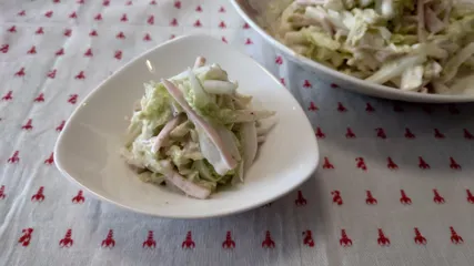 キャベツのコールスローが一般的ですが、旬の白菜でコールスローです。今回はロースハムと合わせましたがコーンと合わせたりもOKです。子どもクッキング教室でも好評メニューです!(^^)!