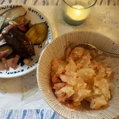 先日、作ったばかりですが、またまた作っちゃいました。今回はジャガイモをあまりつぶさず、ごろごろ感のタラモです。(写真の切り取りがうまくできず、マヨと関係ない料理も入ってすみません)