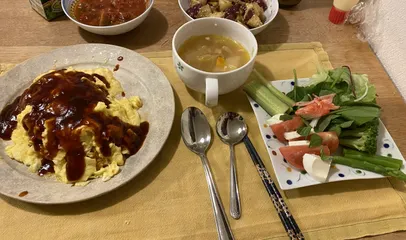 晩ご飯です ドミグラスのふわとろオムライスです。ラタトゥイユ、大学いも、野菜たっぷりコンソメスープ、カプレーゼ、サラダにマヨネーズです。卵にマヨネーズ入れました。