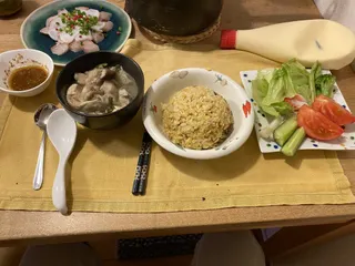 晩ご飯です マヨネーズマジックのパラパラチャーハン作りました😊鮭、鱈、豚バラのみぞれ鍋、ブリとたこの中華風カルパッチョ、サラダにマヨネーズです♪