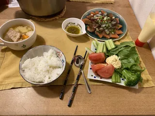 晩ご飯です ポトフ作りました。ほかは、手作りソースのサーモンとたこのカルパッチョ、サラダにマヨネーズです。