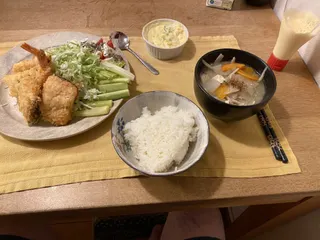 晩ご飯です サーモンとエビのフライ定食です。タルタルはマヨネーズで作りました。豚汁、付け合わせサラダにマヨネーズです。トマトはカプレーゼにしました。