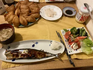 晩ご飯です おいなりさん、秋刀魚、イカ刺し、お味噌汁、カプレーゼ、サラダに瓶マヨネーズです😀