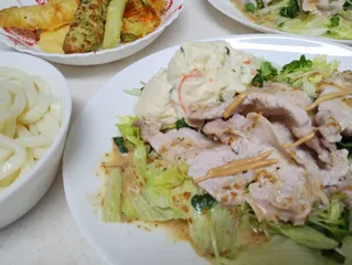 夜マヨ タルタルソースとカボチャのサラダにマヨネーズを使いました。キャベツの千切りには深煎りごまドレッシングを。