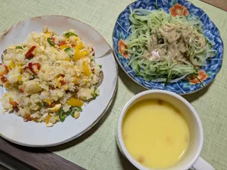 ピーマンたっぷり炒飯 豚肉とピーマンをマヨ炒めしてご飯と卵としらすを加えました。野菜はピーマンとパプリカのみ💦 きゅうりのスライサー千切りには深煎りごまドレッシングを。カップスープを添えて😋