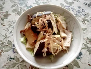 なすドッグマヨがけ ナスに切れ目を入れて、側面に味噌を塗り、鶏むね肉を挟みました。キャベツなどの野菜と一緒に、ごま油をふりかけ、電子レンジで加熱。仕上げに、マヨネーズとかつお節。ナス1本丸々使うので、ボリュームがありました。🥰✨🌰🌰