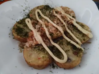 たこ焼き+世界マヨ 芳醇トリュフ味 冷凍たこ焼きに世界を味わうマヨ 芳醇トリュフ味をかけて頂きました。( たこ焼きの向きはあえて逆さです😅)