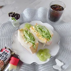 簡単サンド(マヨ 世界マヨ 芳醇トリュフ味) パンの片面にマヨネーズ、もう一方に世界を味わうマヨ 芳醇トリュフ味を塗りました。 レタス、チーズ、ロースハム、卵焼きをサンドしました。
