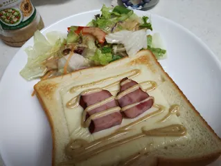 チーズ+世界マヨ トースト(芳醇トリュフ味) 食パンにチーズ+焼豚をのせ 世界を味わうマヨ芳醇トリュフ味で線引きしトーストしました。パンチのある味わいになりました。 サラダでさっぱりと深煎りごまドレッシング 薬味ポン酢味をかけて頂きました。 美味しくいただきました。😊