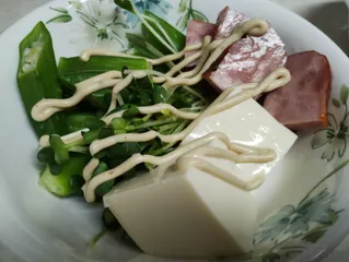 あと一品(世界マヨ芳醇トリュフ味) 塩茹でしたオクラ、カイワレ大根、豆腐、焼豚に世界を味わうマヨ芳醇トリュフ味をかけて頂きました。 昨日は冷蔵庫にあるもので、、。