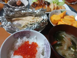 まよと醤油をたっぷりのせてホイル焼きに。野菜やきのこ、鮭もとっても美味しくなりました。蒸された時に出た残り汁、勿体ないので卵で茶碗蒸しも!美味しかったです😊